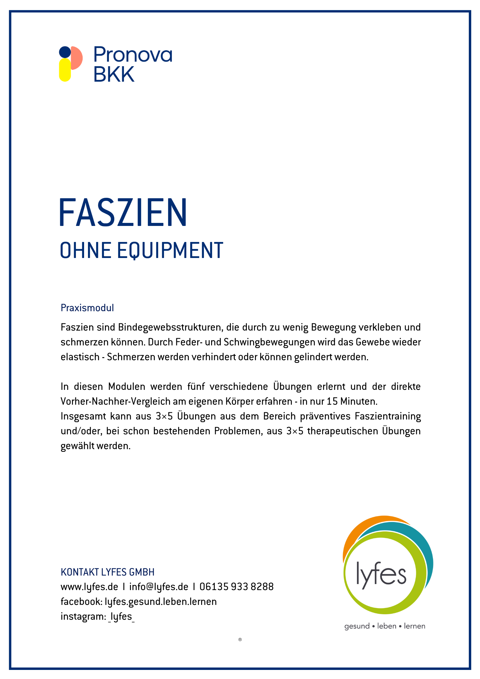 Insgesamt kann aus 3×5 Übungen aus dem Bereich präventives Faszientraining und/oder, bei schon bestehenden Problemen, aus 3×5 therapeutischen Übungen gewählt werden.
