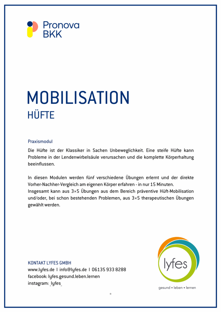 Insgesamt kann aus 3×5 Übungen aus dem Bereich präventive Hüft-Mobilisation und/oder, bei schon bestehenden Problemen, aus 3×5 therapeutischen Übungen gewählt werden.