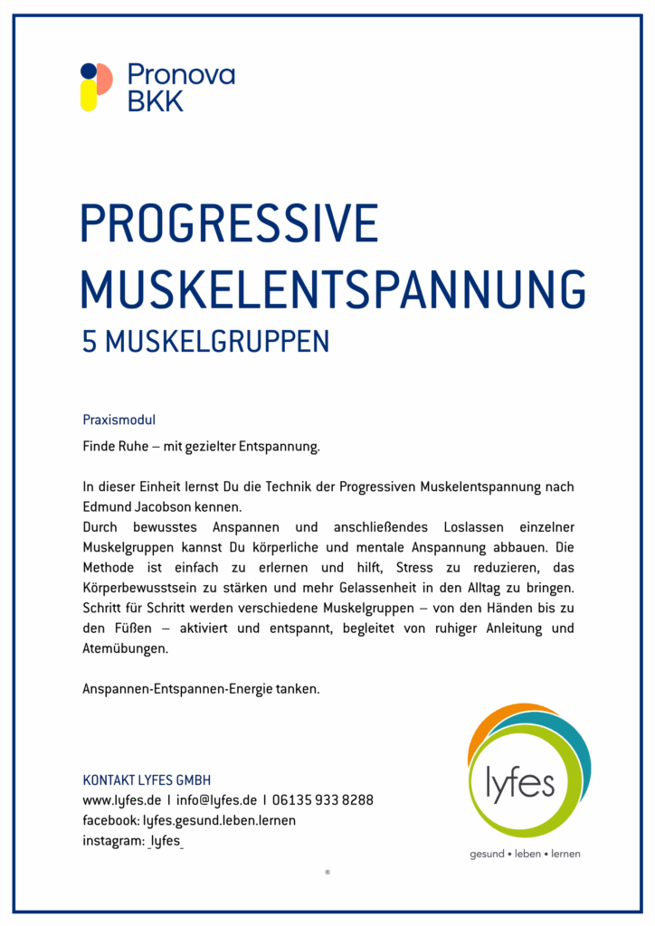 Durch bewusstes Anspannen und anschließendes Loslassen einzelner Muskelgruppen kannst Du körperliche und mentale Anspannung abbauen. Die Methode ist einfach zu erlernen und hilft, Stress zu reduzieren, das Körperbewusstsein zu stärken und mehr Gelassenheit in den Alltag zu bringen. Schritt für Schritt werden verschiedene Muskelgruppen – von den Händen bis zu den Füßen – aktiviert und entspannt, begleitet von ruhiger Anleitung und Atemübungen.
