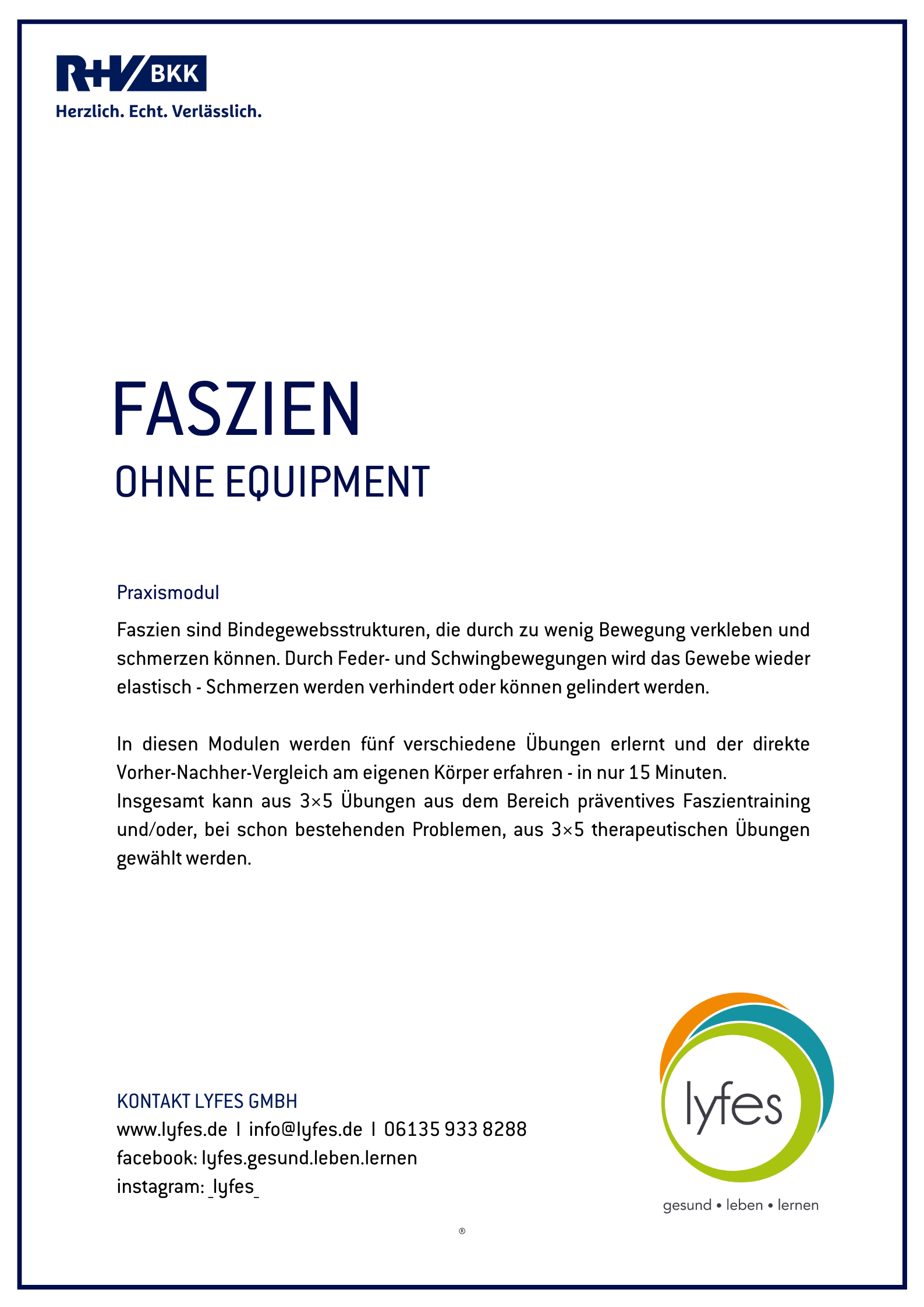 Insgesamt kann aus 3×5 Übungen aus dem Bereich präventives Faszientraining und/oder, bei schon bestehenden Problemen, aus 3×5 therapeutischen Übungen gewählt werden.