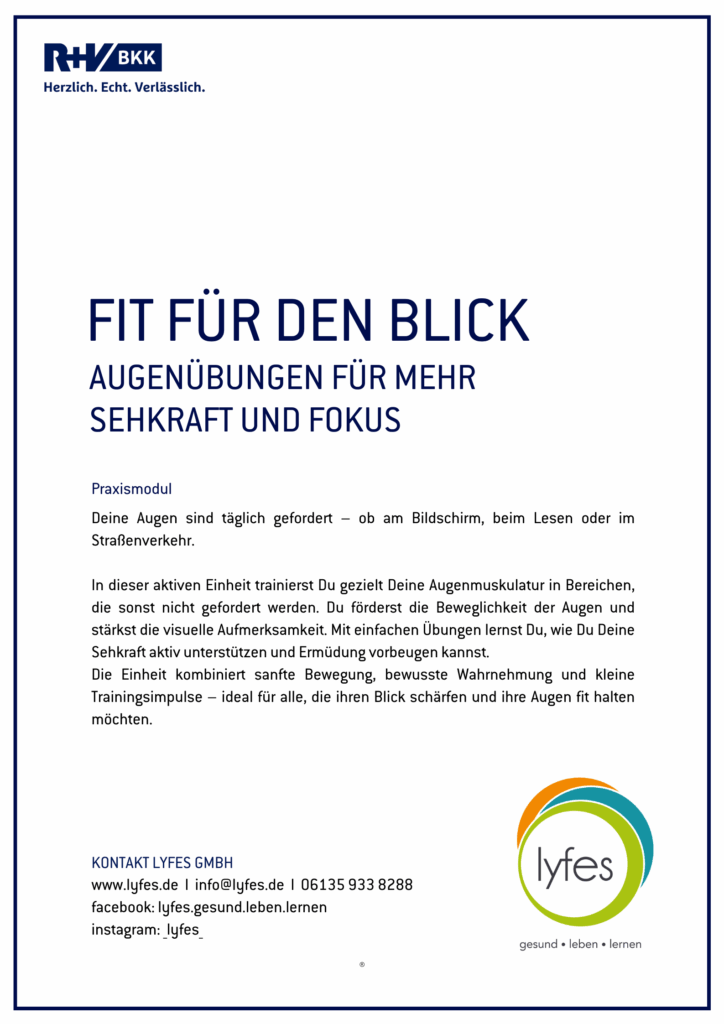 Die Einheit kombiniert sanfte Bewegung, bewusste Wahrnehmung und kleine Trainingsimpulse – ideal für alle, die ihren Blick schärfen und ihre Augen fit halten möchten.