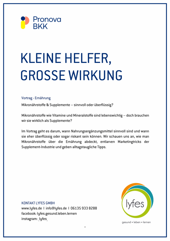 Mikronährstoffe wie Vitamine und Mineralstoffe sind lebenswichtig – doch brauchen wir sie wirklich als Supplemente? Im Vortrag geht es darum, wann Nahrungsergänzungsmittel sinnvoll sind und wann sie eher überflüssig oder sogar riskant sein können. Wir schauen uns an, wie man Mikronährstoffe über die Ernährung abdeckt, entlarven Marketingtricks der Supplement-Industrie und geben alltagstaugliche Tipps.