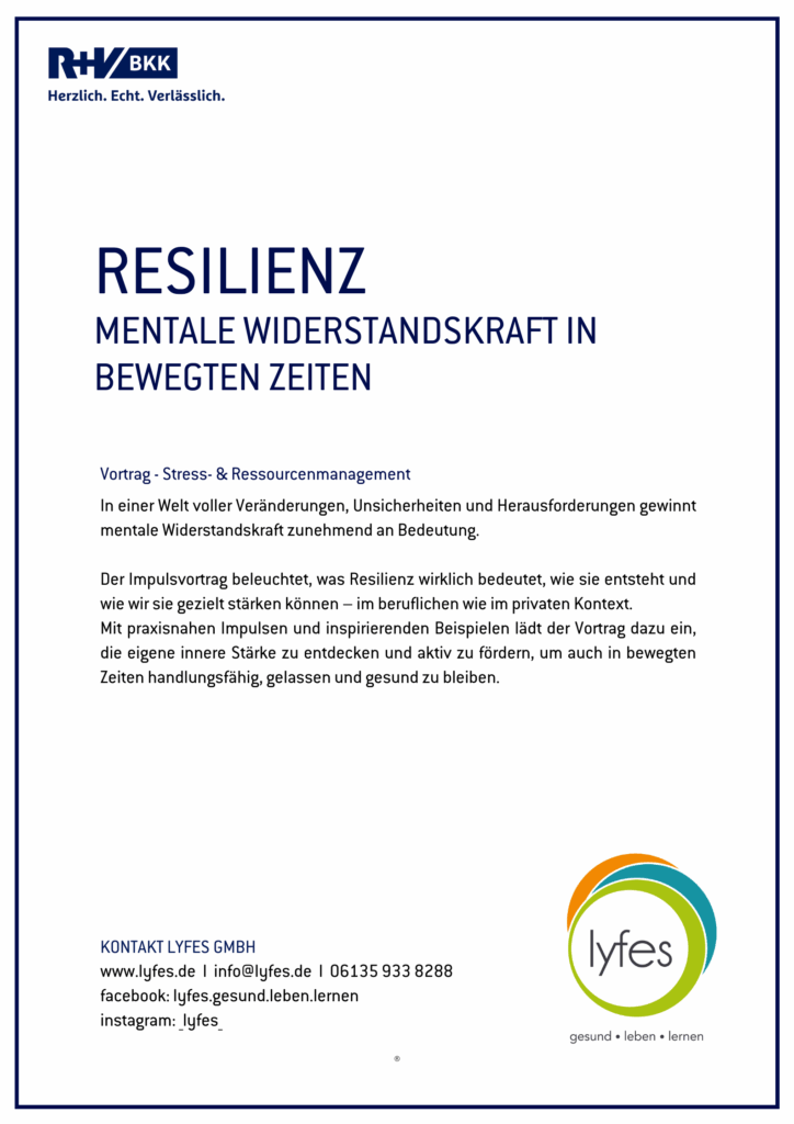 In einer Welt voller Veränderungen, Unsicherheiten und Herausforderungen gewinnt mentale Widerstandskraft zunehmend an Bedeutung. Der Impulsvortrag beleuchtet, was Resilienz wirklich bedeutet, wie sie entsteht und wie wir sie gezielt stärken können – im beruflichen wie im privaten Kontext. Mit praxisnahen Impulsen und inspirierenden Beispielen lädt der Vortrag dazu ein, die eigene innere Stärke zu entdecken und aktiv zu fördern, um auch in bewegten Zeiten handlungsfähig, gelassen und gesund zu bleiben.
