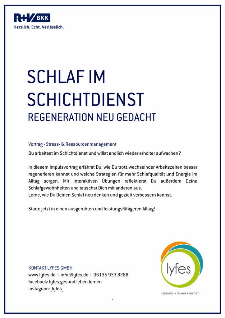 In diesem Impulsvortrag erfährst Du, wie Du trotz wechselnder Arbeitszeiten besser regenerieren kannst und welche Strategien für mehr Schlafqualität und Energie im Alltag sorgen. Mit interaktiven Übungen reflektierst Du außerdem Deine Schlafgewohnheiten und tauschst Dich mit anderen aus.