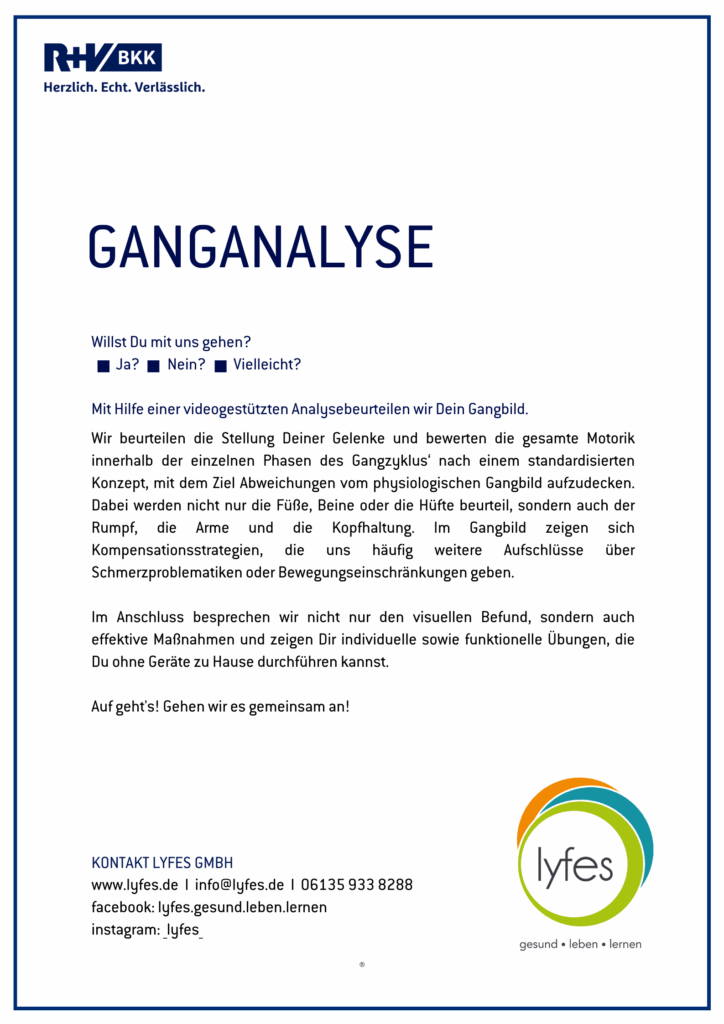 Wir beurteilen die Stellung Deiner Gelenke und bewerten die gesamte Motorik innerhalb der einzelnen Phasen des Gangzyklus nach einem standardisierten Konzept, mit dem Ziel Abweichungen vom physiologischen Gangbild aufzudecken. Dabei werden nicht nur die Füße, Beine oder die Hüfte beurteil, sondern auch der Rumpf, die Arme und die Kopfhaltung. Im Gangbild zeigen sich Kompensationsstrategien, die uns häufig weitere Aufschlüsse über Schmerzproblematiken oder Bewegungseinschränkungen geben.