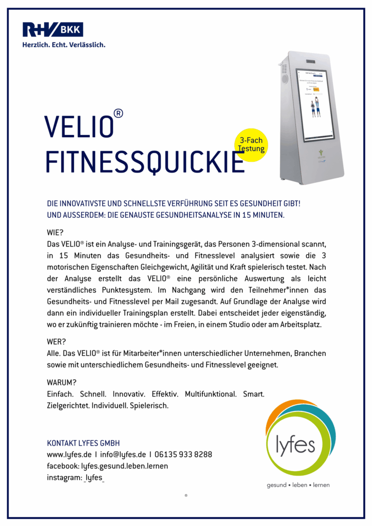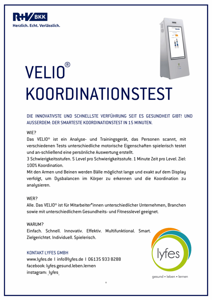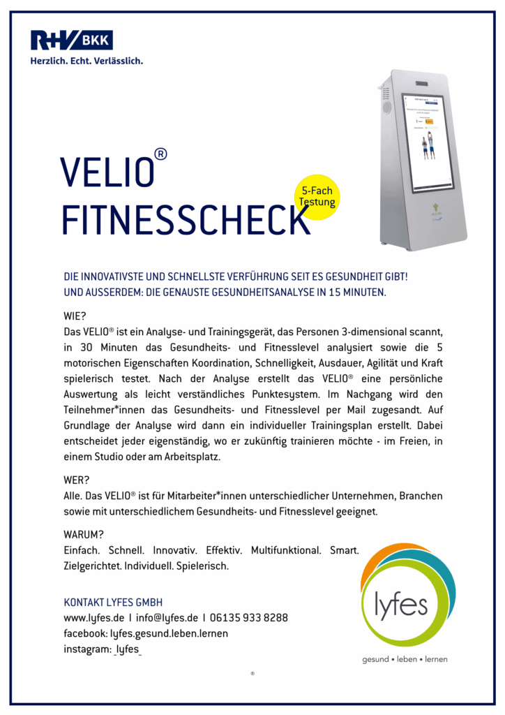 Aha! Nach der Analyse erstellt das VELIO® Deine persönliche Auswertung - übersichtlichen als leicht verständliches Punktesystem und sendet Dir Dein aktuelles Gesundheits- und Fitnesslevel digital per Mail.
